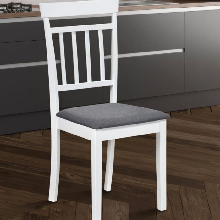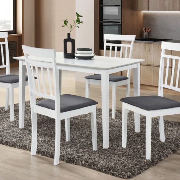 Setul contine blatul de masa din MDF de 18 mm lacuit si picioarele mesei din lemn masiv, iar scaunele sunt din lemn masiv , tapitate cu textil rezistent pe sezut.