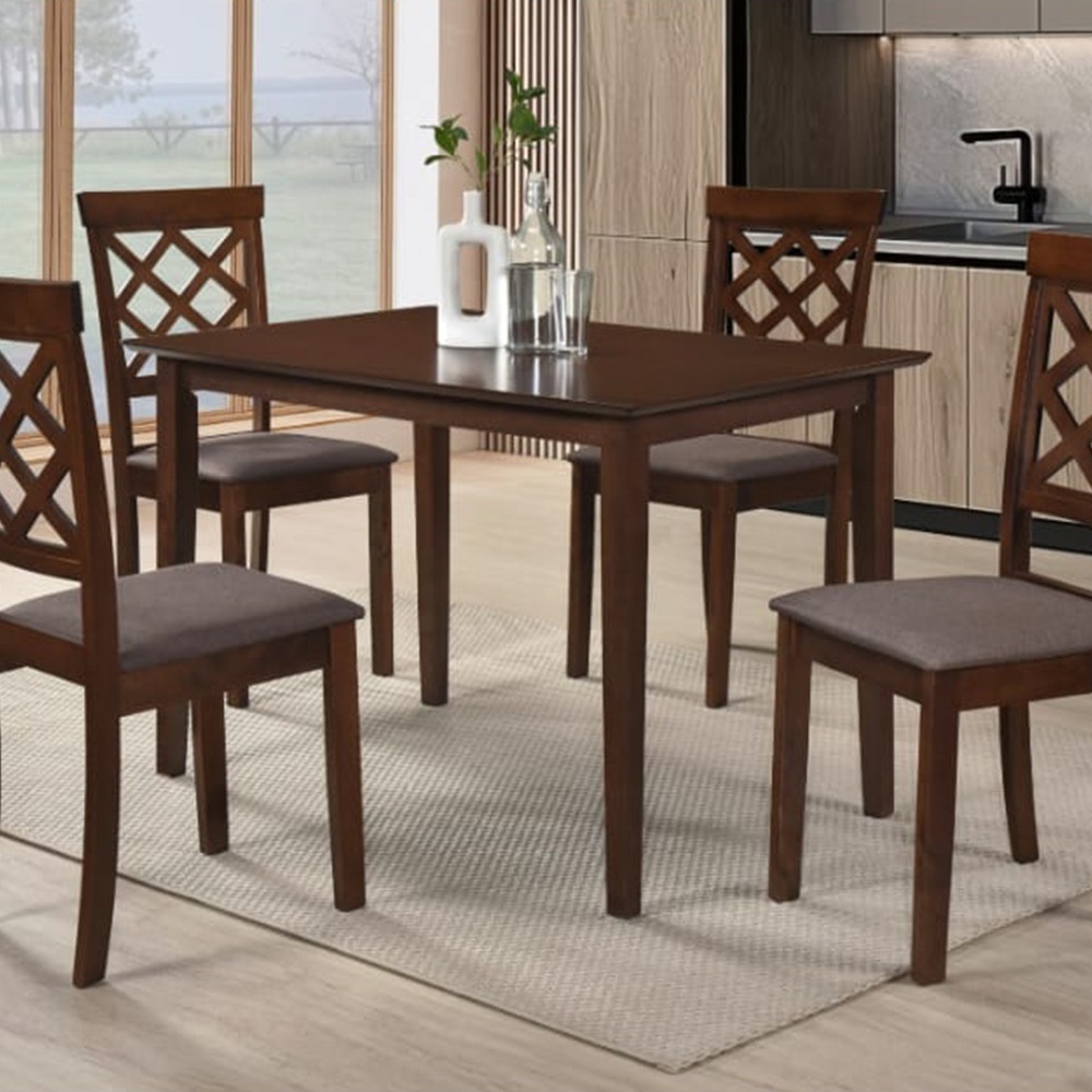Setul contine blatul de masa din MDF de 18 mm lacuit si picioarele mesei din lemn masiv, iar scaunele sunt din lemn masiv , tapitate cu textil rezistent pe sezut.